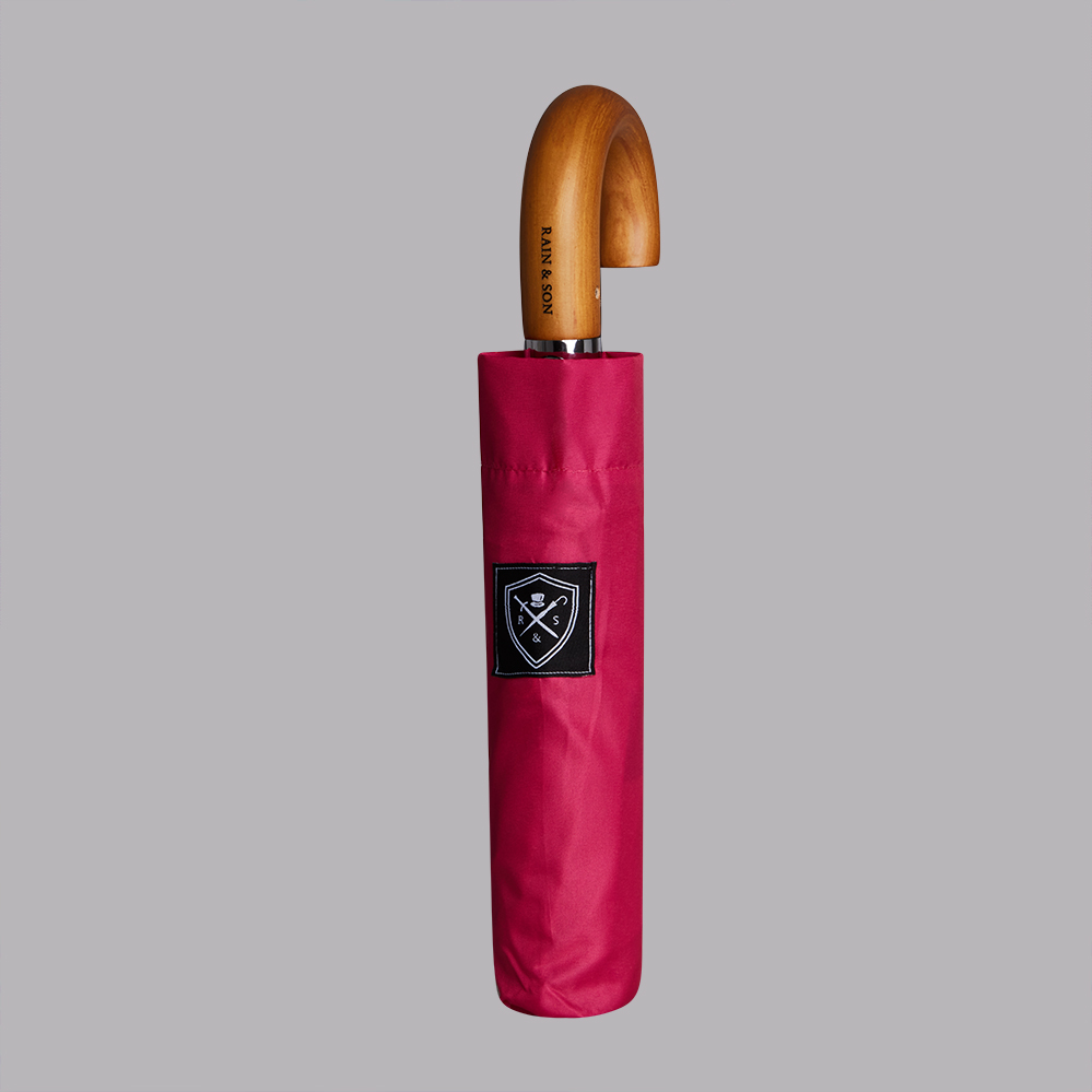 This dark pink compact umbrella from Rain & Son is a particular ecofriendly choice with a canopy crafted from 100% recycled plastic bottles, mostly found in our oceans. As a tribute to our wonderful oceans this dark pink umbrella is part or our Ocean collection where 5 % of the profit goes to cleaning up the world’s oceans. Be trendy with a more sustainable dark pink umbrella in the rain. Rain & Son’s classic dark pink compact umbrella is a great choice for many occasions. Stand out in the crowd with this strong color or use the compact umbrella on your special day to get out of the rain. This collapsible umbrella is also a perfect gift for someone who loves pink or maybe as a present for a baptism, naming ceremony or birthday. The umbrella is easy to bring everywhere, so you are always ready for rain or why not use it when the sun is too strong. The compact umbrella has a curved wooden handle, adding sophistication to your look and making it comfortable to carry. The large panel of the umbrella, opening to a diameter of 103 centimeters, will protect you and your loved ones from rain. The high-quality foldable umbrella has a strong metal frame to endure bad weather. The compact umbrella has an automatic opening and closing function making it easy to open and close, just press the button on the curved wooden handle.